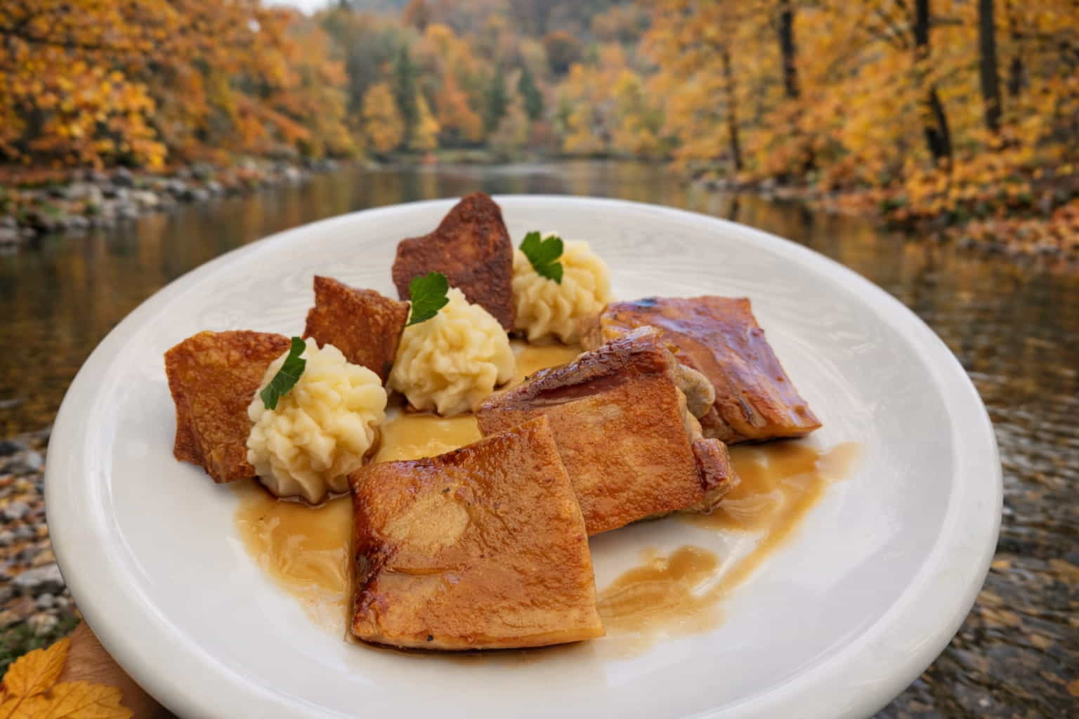 Cochinillo deshuesado y cocinado a 80ºC durante 12hs, servido con su piel crujiente, pure de patata a la mantequilla y salsa española