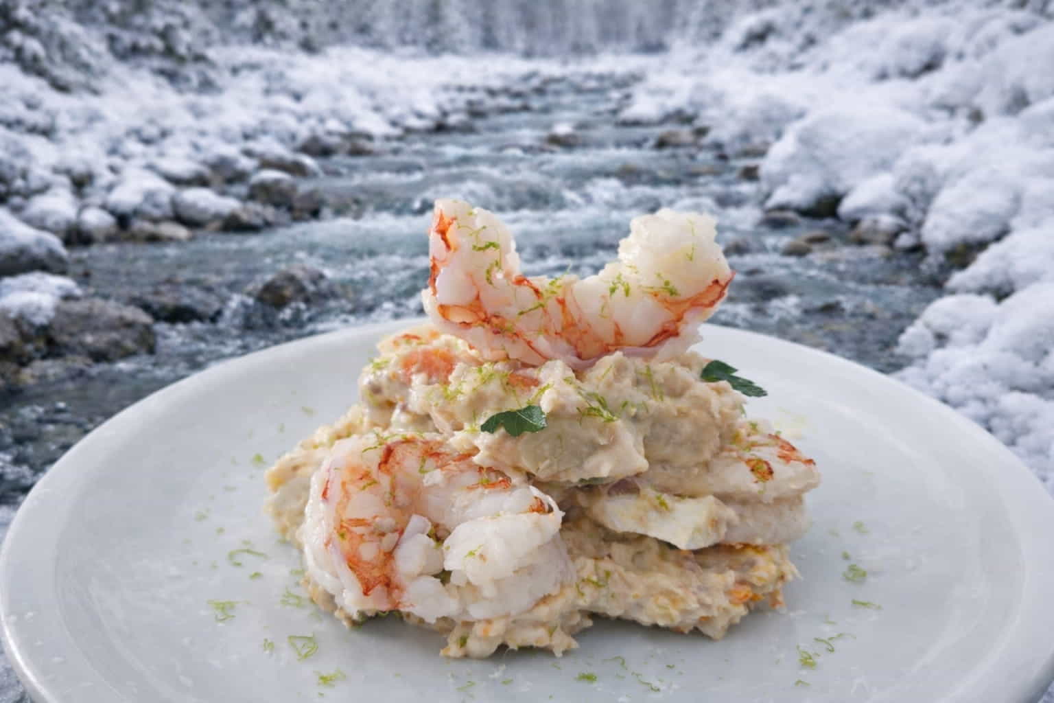 Langostinos, atun, huevo duro, zanahoria, guisantes, patata y salsa rosa