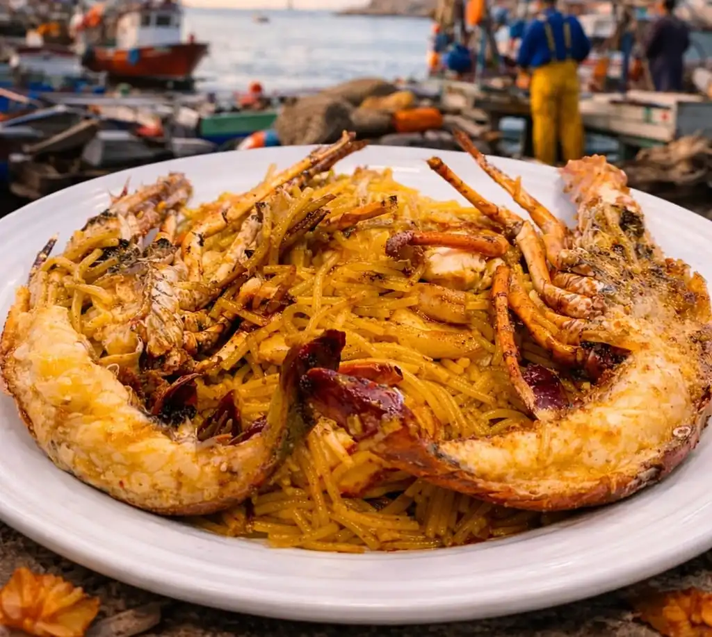 Fideo n°2 con Langosta, sepia, langostinos. Sofrito de cebolla, ajo, tomate natural, pimentón y azafran