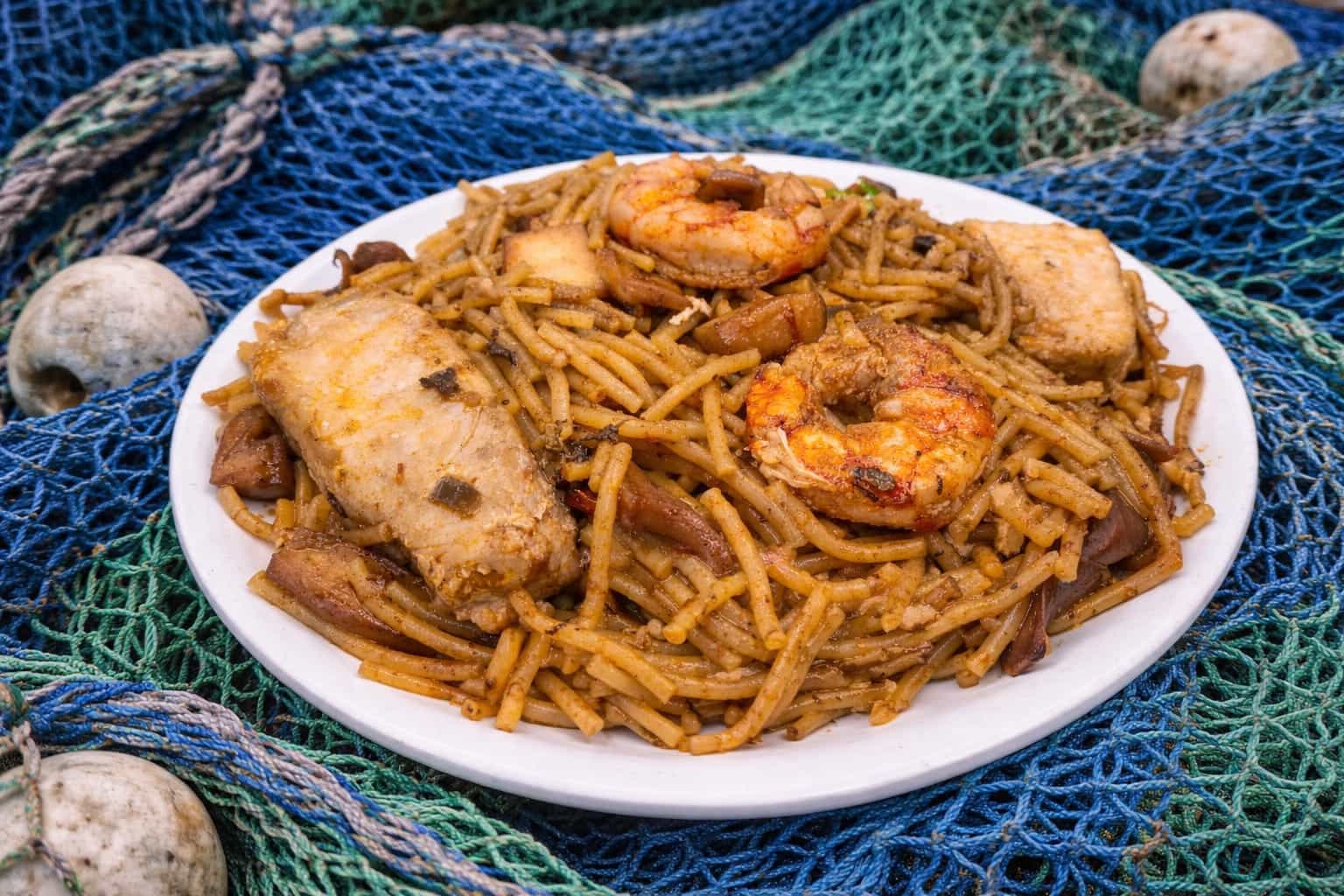 Fideo n°2 con, sepia, calamar, langostinos, mero fresco y cangrejos. Sofrito de cebolla, ajo, tomate natural, pimentón y azafran