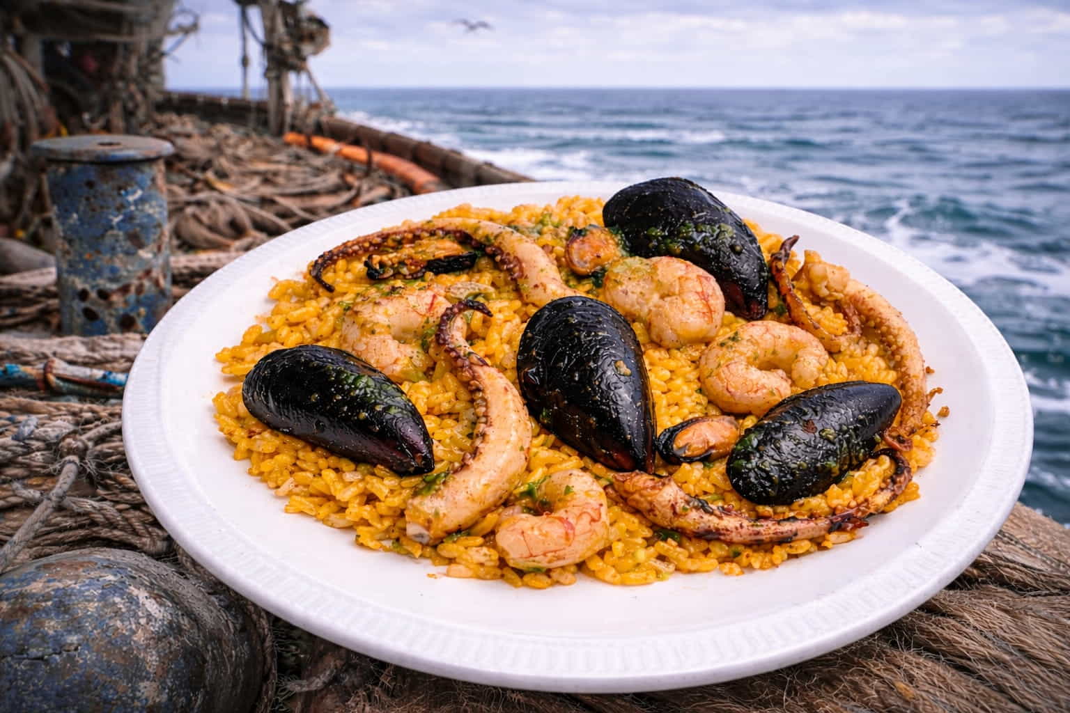 Arroz español, aceite de oliva extra virgen, calamar, camarones, mejillones, langostino importación , azafran español, ajo, pimentón dulce español, tomate triturado, caldo de pescado y marisco natural ( APTO PARA CELIACOS)