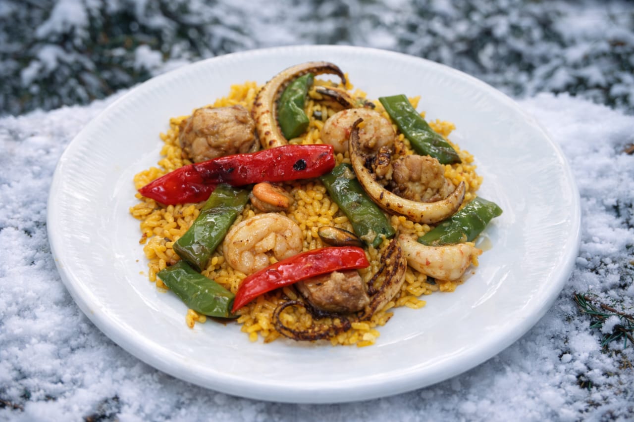 Arroz español, aceite de oliva extra virgen, pollo, calamar, mejillones langostino importacion, camarones, chaucha plana, tiras de pimiento rojo, ajo, azafran español, pimentón dulce español, tomate triturado. (APTO PARA CELIACOS)
