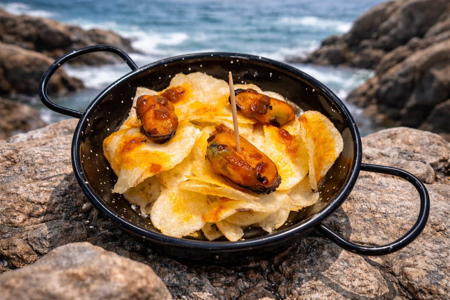 Papas, mejillones, cebolla, zanahoria, ajo, laurel, vino blanco, vinagre, aceite de oliva, sal