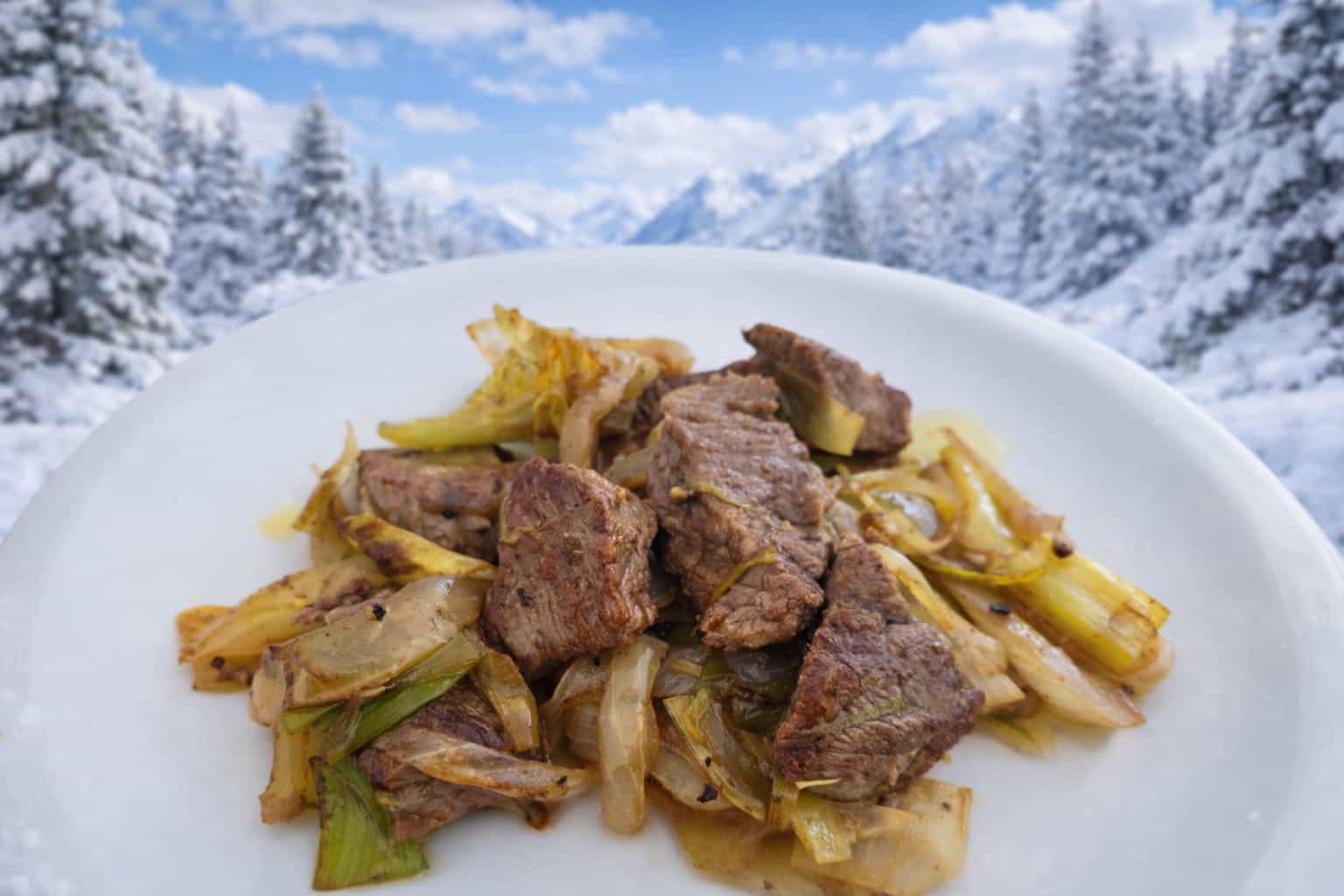 Solomillo de ternera, puerro, cebolla, sal, pimienta y aceite de oliva